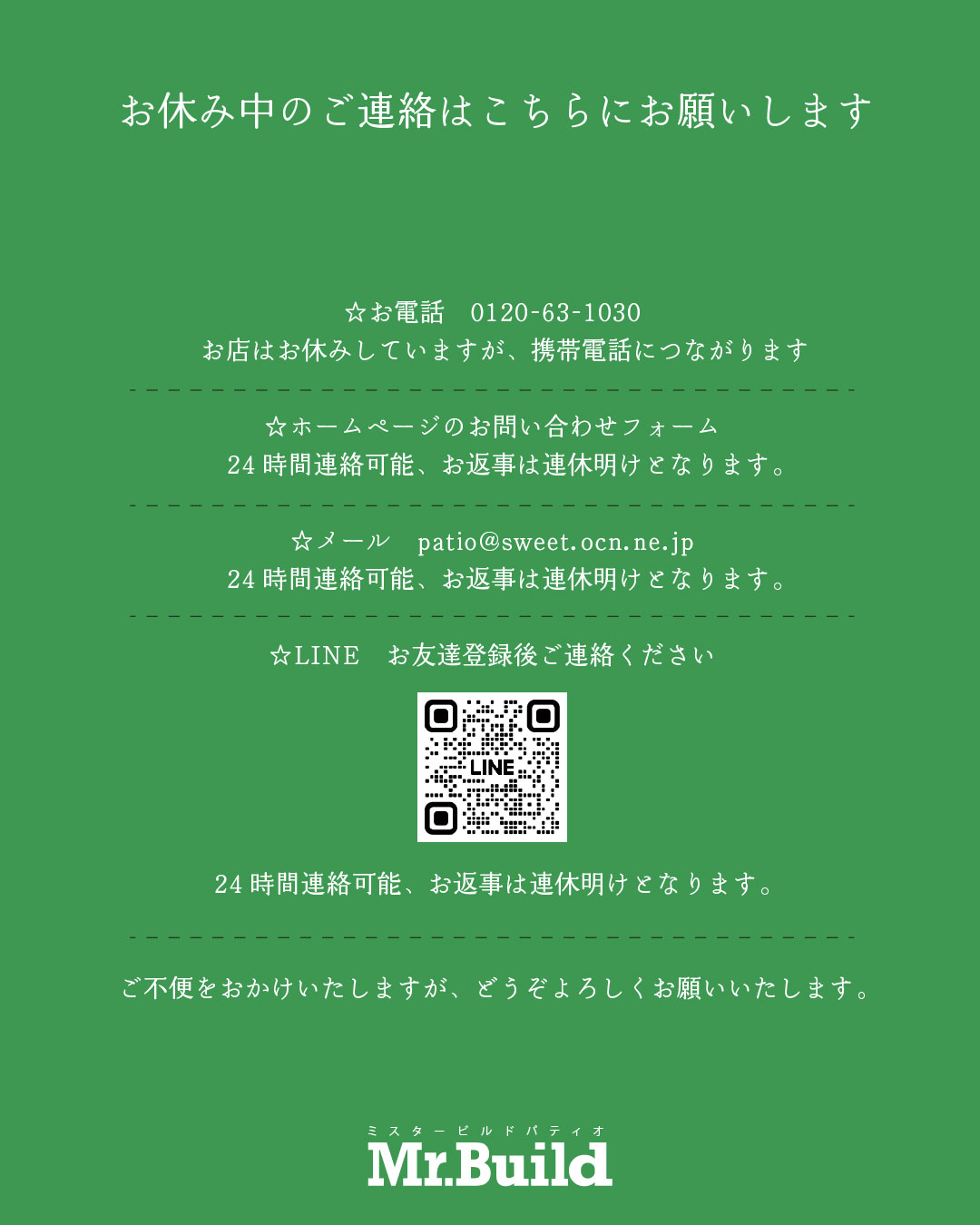 お電話以外のお問い合わせは、休み明けの返信となりますのでご了承ください。
